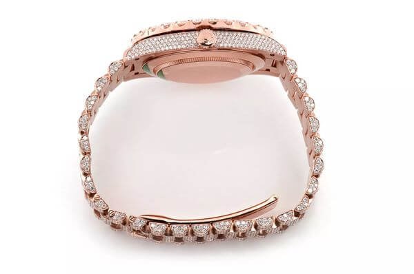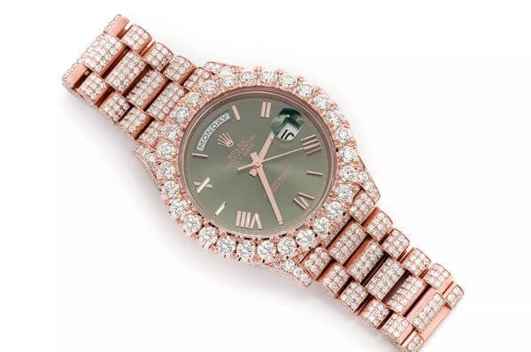 This bust down watch Rolex Day-Date is made of green and 40mm with 23.00ctw of Moissanite diamonds. This watch inside and out to Rolex quality standards.