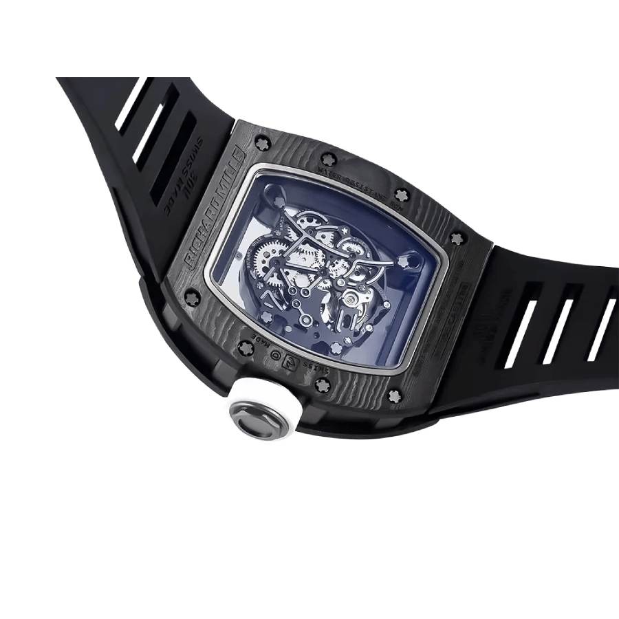 The Richard Mille RM055 White Legend Replica is a luxurious tourbillon watch with a sleek black NTPT Carbon Fiber case and bezel. It is powered by an automatic movement with a caliber of RM055 and a power reserve of 60 hours. The precision of the watch is within COSC certification limits. with a sweep motion second hand. The watch also features a black rubber bracelet with adjustable links and a 904L stainless steel deployant clasp. The skeleton dial has dot indices and 904L stainless steel stick hands. The watch is also water-resistant up to 30m and comes with a 2 year international warranty.