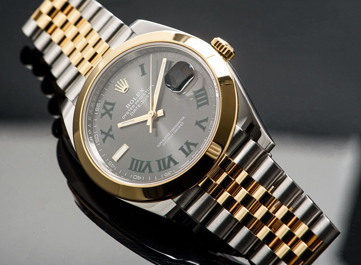 41mm Yellow Rolesor case with 904L steel monobloc middle case, screw-down steel back, 18K yellow gold screw-down crown, 18K yellow gold smooth bezel, scratch-resistant double anti-reflective sapphire crystal with cyclops lens over the date, slate dial, green Roman numerals, Rolex calibre 3235 perpetual self-winding movement with date at 3 o’clock that changes instantaneously at midnight in a few thousandths of a second, approximately 70 hours of power reserve, yellow Rolesor Jubilee bracelet made from a combination of 904L steel and 18K yellow gold with five-piece links, folding Oysterclasp buckle with Easylink 5mm comfort extension link. Waterproof to 100 meters.