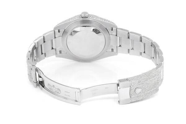 This silver-colored Rolex DateJust iced out watch has a 41mm case and 23.50ctw of Moissanite diamonds. This watch has received in-depth maintenance to the exacting standards of Rolex by our skilled watchmakers. The Rolex box for this watch is included.