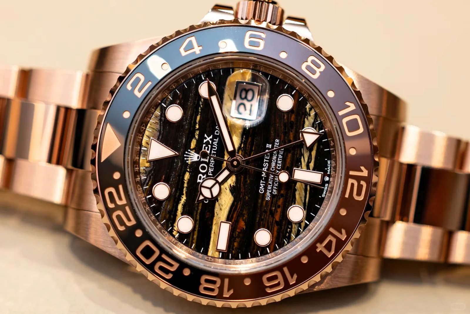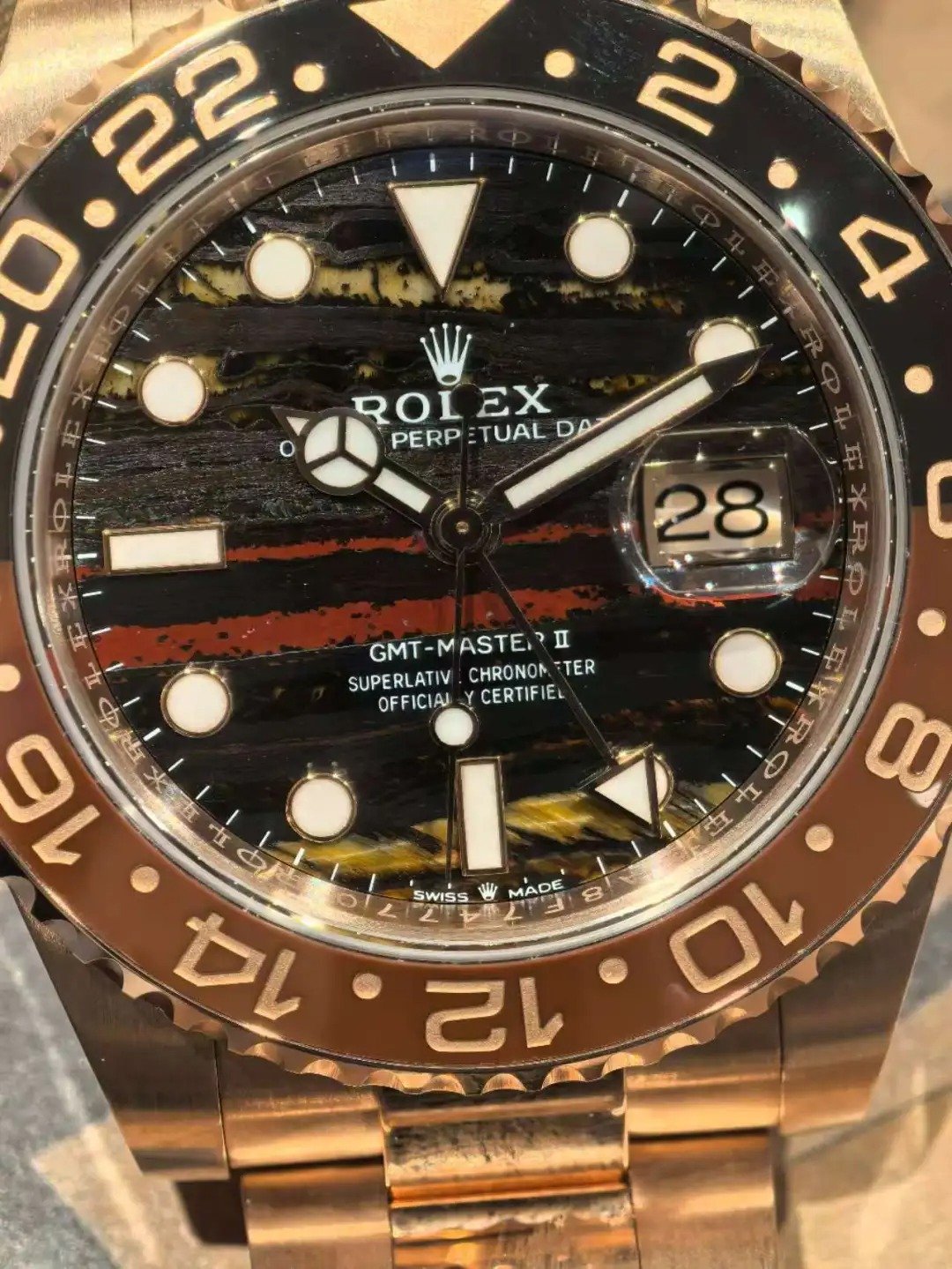 A 1:1 Swiss Super Clone of the Oyster Perpetual GMT-Master II in 18K yellow gold with a rare Tiger Eye dial. The striking brown-golden tiger-eye stone dial gives the watch a unique natural luxury look, paired with luminous hour markers for readability.
