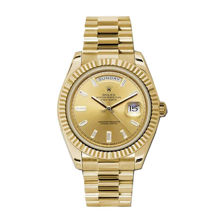 The dial itself. resplendent in champagne. showcases stick and dot indices alongside sleek stick hands. perfectly orchestrating a harmonious display of time. The functionality extends beyond mere timekeeping. incorporating hours. minutes. seconds. date. and day indicators with impeccable clarity. Water-resistant up to 30 meters. this Rolex gold replica is built to withstand everyday splashes. merging practicality with elegance.